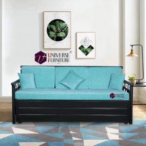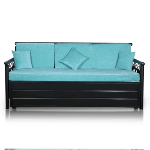 Numaiz Metal Matte Finish Black Sofa Cum Bed with Hydraulic Storage – 3 Seater | Black Frame, Light Turquoise